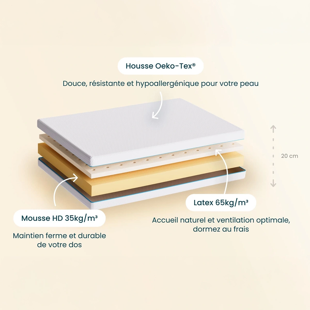 1 couche Latex (65kg/m³ minimum) de 4cm, accueil moelleux et respirant